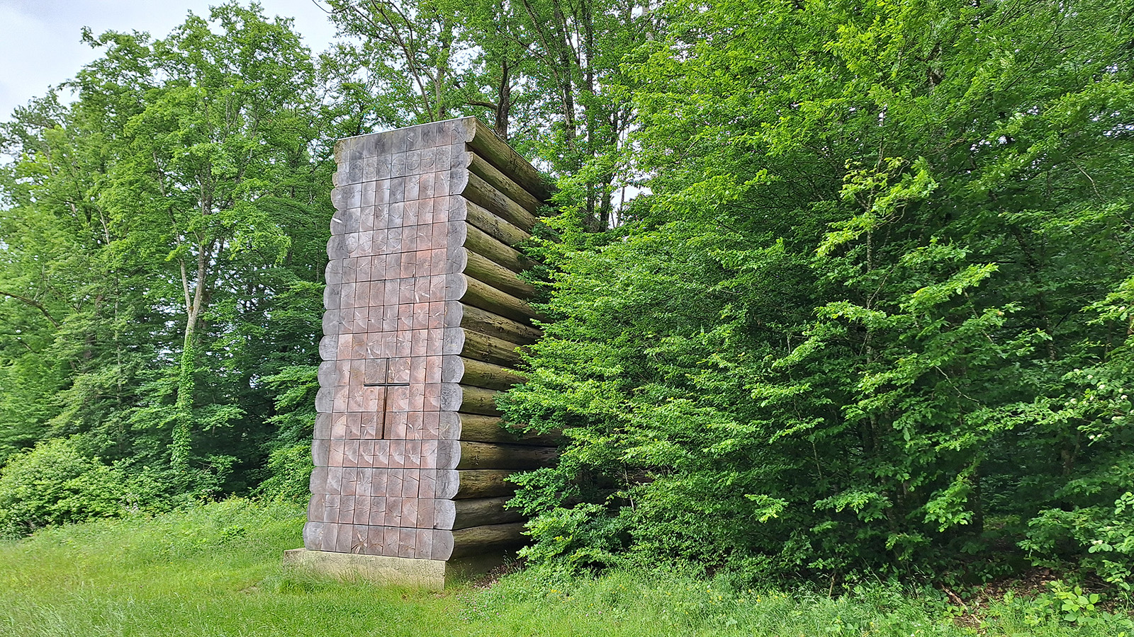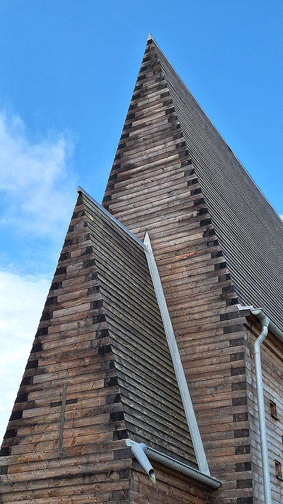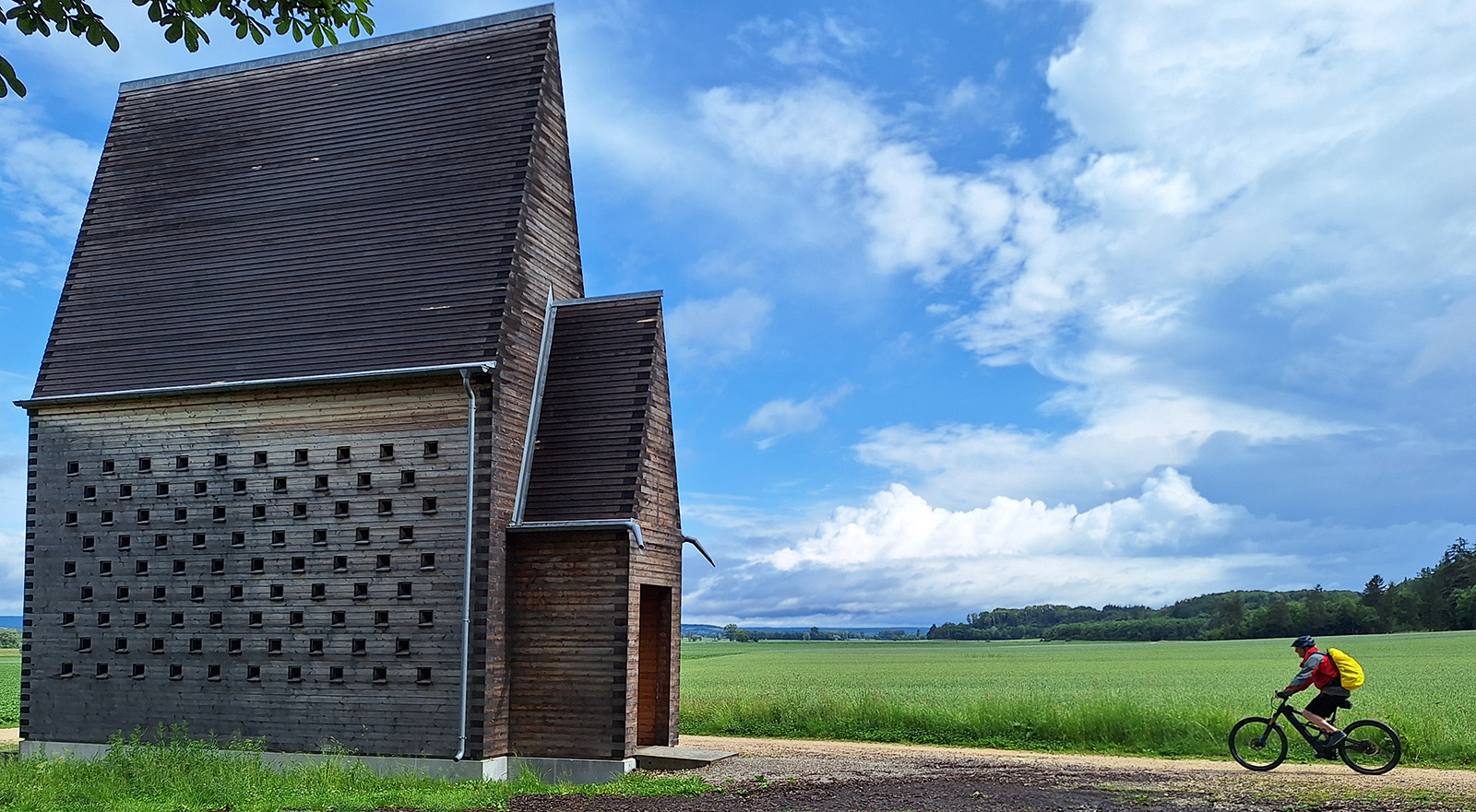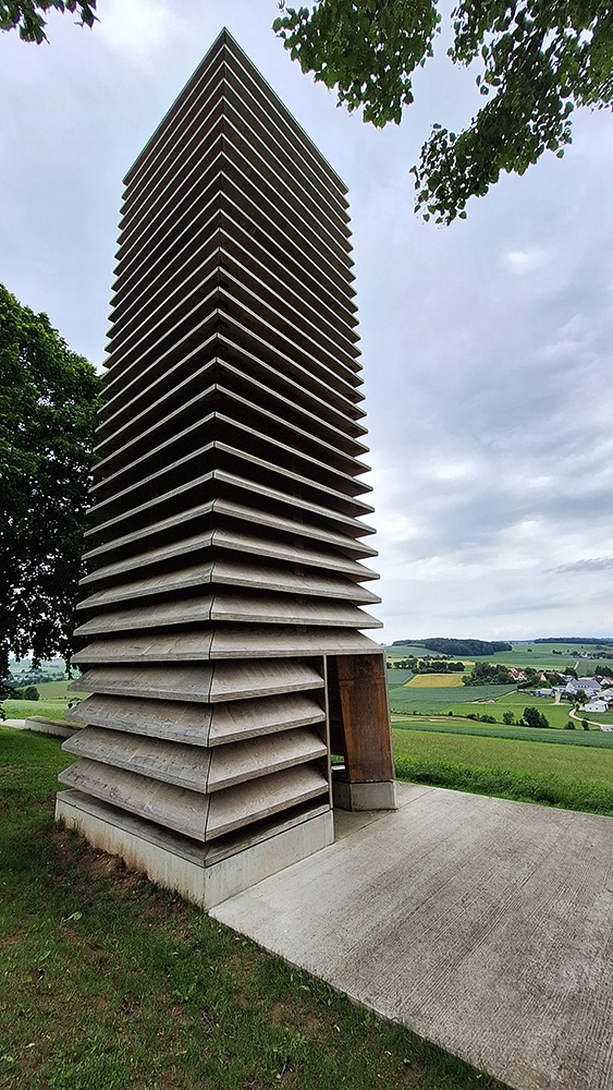 Überwiegend auf Forst- und Fahrradwegen unterwegs, erblickten wir meist schon von weitem das nächste sakrale Bauwerk in der Landschaft. Wie eine Landmarke liegt inmitten von Feldern an einem leichten Hang über Kesselostheim die Kapelle von Staab Architekten. Der 14 Meter hohe Kapellenturm ist aus einzelnen Holzlamellen gefügt, die sich wie ein Flügelschlag zum Himmel auffächern. Sie bilden eine durchlässige Raumhülle, durch die Sonnenlicht, Wind, Regen und Schnee ins Innere der Kapelle gelangen und den Innenraum in unmittelbarer Verbindung zur umgebenden Landschaft halten. Mit zunehmender Höhe verengt sich der Innenraum und wird schließlich von einem Kreuz begrenzt, das die hölzerne Tragkonstruktion in die Öffnung zeichnet.