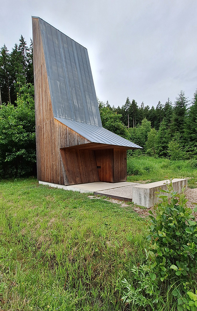 Ganz anders die Kapelle Unterliezheim von John Pawson, die an einem Hang direkt aus dem Wald wächst. Mit dem Blick über die schwäbische Landschaft und zum Kirchturm des Dorfes, versteht man die Absicht des Erbauers, die Holzkapelle nicht als ein konventionelles Architekturwerk, sondern eher als ein Fundstück zu begreifen.