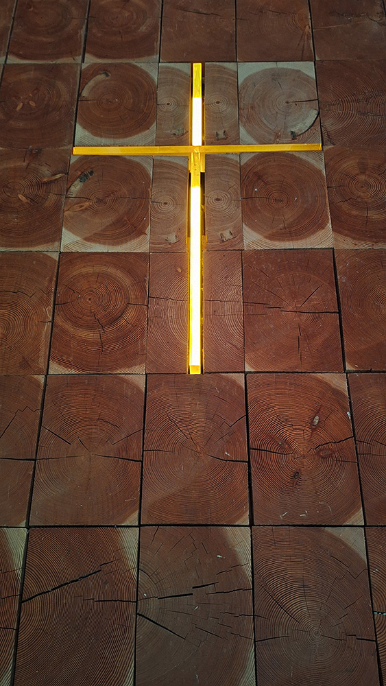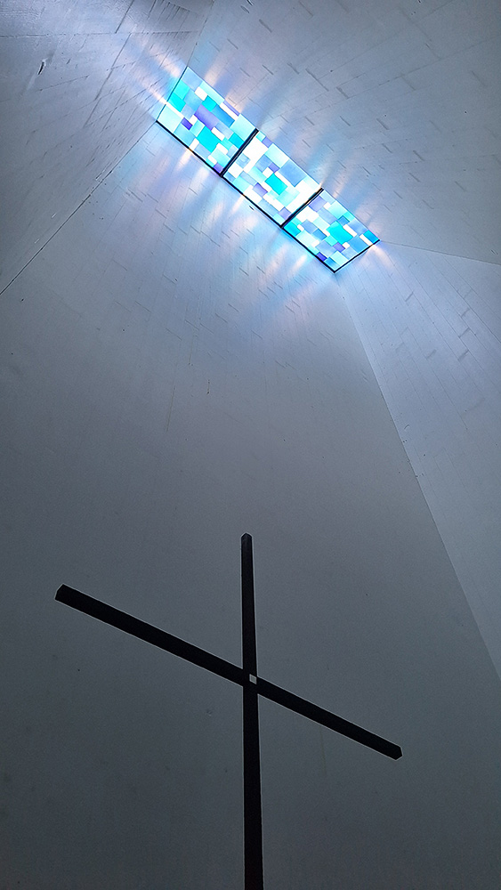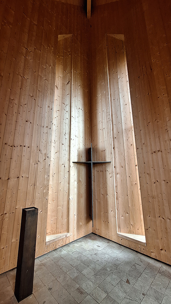 Im Innern kommt man zur Ruhe und der Blick fällt auf das Kreuz im Licht. Hell und Dunkel modellieren den Raum, dessen Holzmaterialität alle Sinne umfängt. Ein Innen, das Geborgenheit, Konzentration und Ruhe ermöglicht. Schaut man durch die wenigen Ausschnitte nach draußen, nimmt man die umliegende Landschaft nur ausschnitthaft wahr.