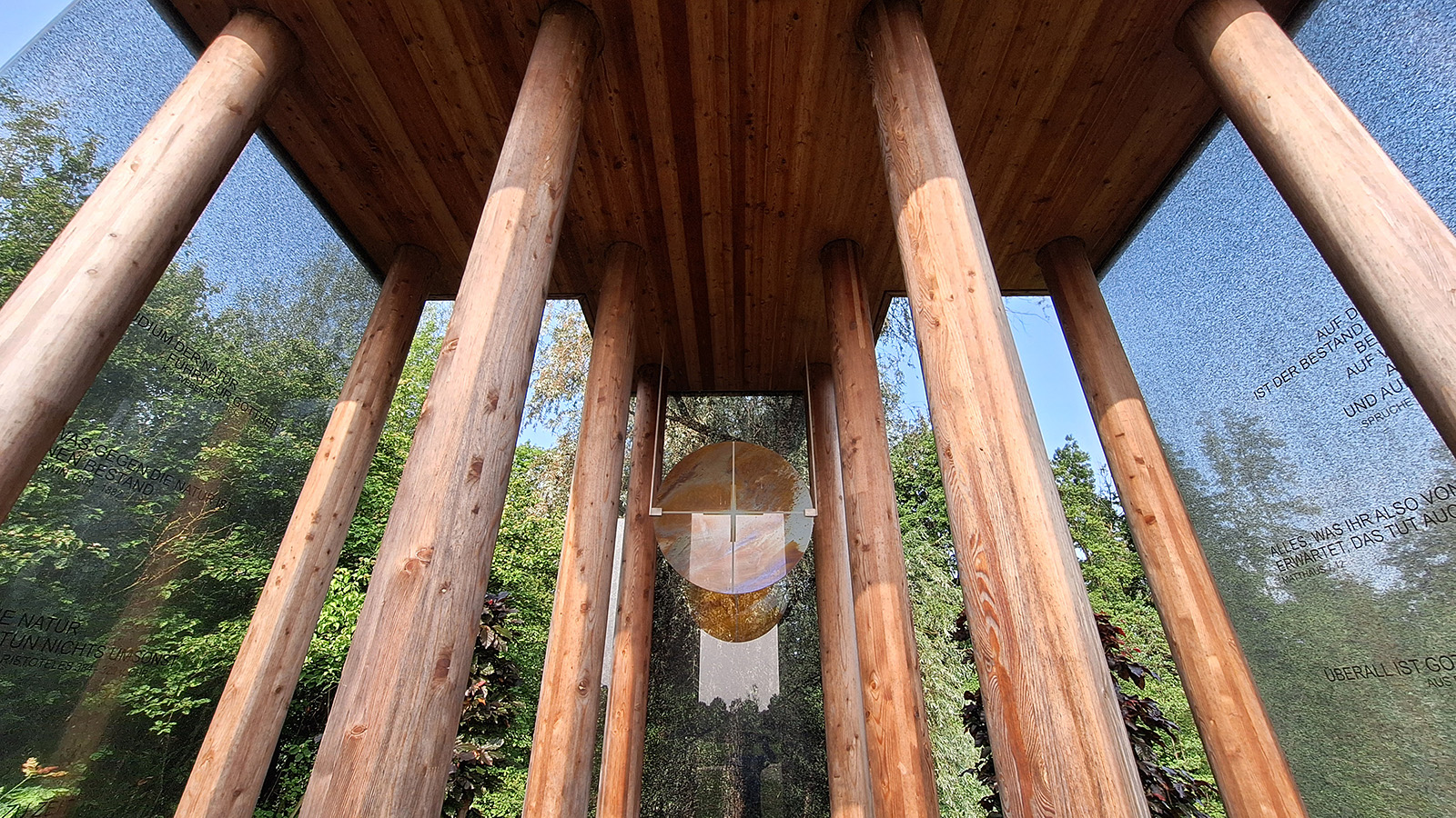 Ein schönes und bereicherndes Erlebnis, das uns gedanklich die nächsten Kilometer bis zur Kapelle von Hans Engel begleitete. Im flachen Donautal auf dem Weg von Offingen nach Gundelfingen steht die wie ein kleiner römischer Tempel anmutende Kapelle neben einem Angelteich. Der kreuzförmige Grundriss umschließt einen offenen Raum und zwei Sitznischen. Das flache Holzdach wird von zwölf gedrechselten Rundsäulen aus verleimtem Lärchenholz getragen. Drei große Glaswände sind grafisch mit Blattmotiven gestaltet und die vier Ecken werden als „grüne“ Wände aus Blutbuchen gebildet. Hier war für uns gut nachvollziehbar, daß der Erbauer mit seinem Entwurf das Außen und das Innen in Verbindung bringt, um Natur und Architektur intensiv erlebbar zu machen.