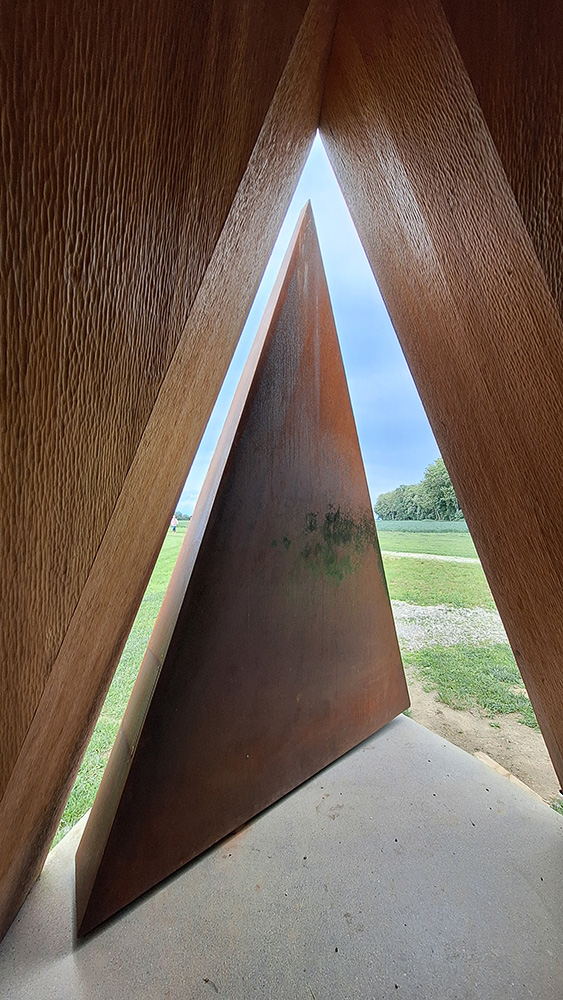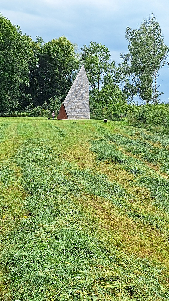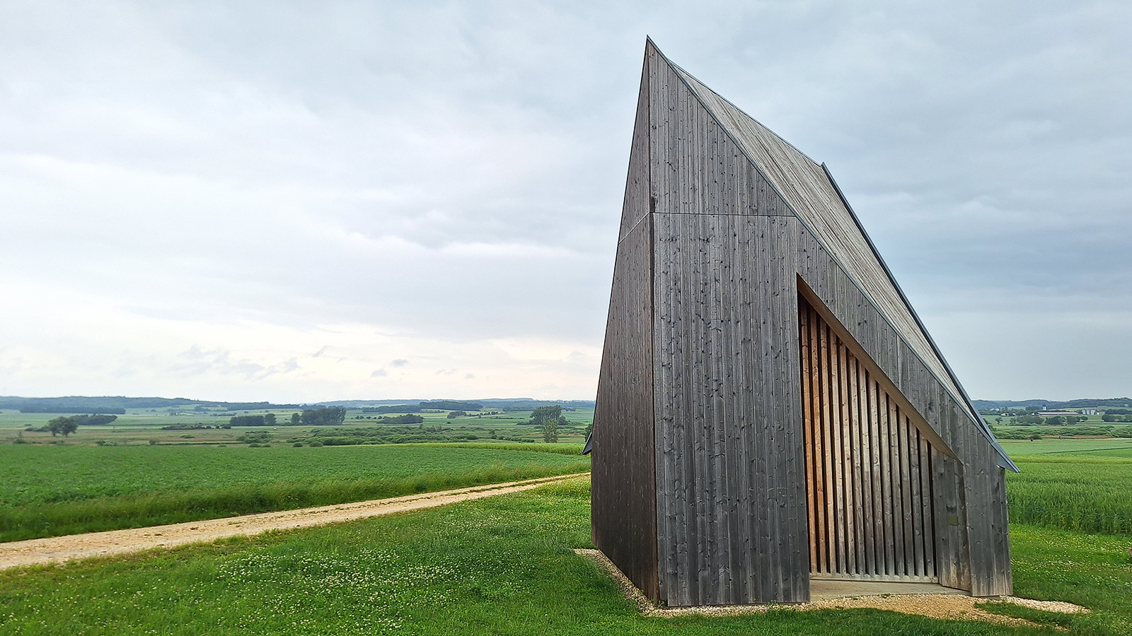 An einer Weggabelung am Radweg von Oberbechingen nach Dattenhausen sahen wir schon aus der Ferne die markante Wegkapelle von Frank Lattke in freier Landschaft stehen. Der quadratische Raum mit einer Grundfläche von knapp fünf mal fünf Metern wird überspannt von einem steilen hohen Sparrendach, das über der Diagonalen tief nach unten fällt.