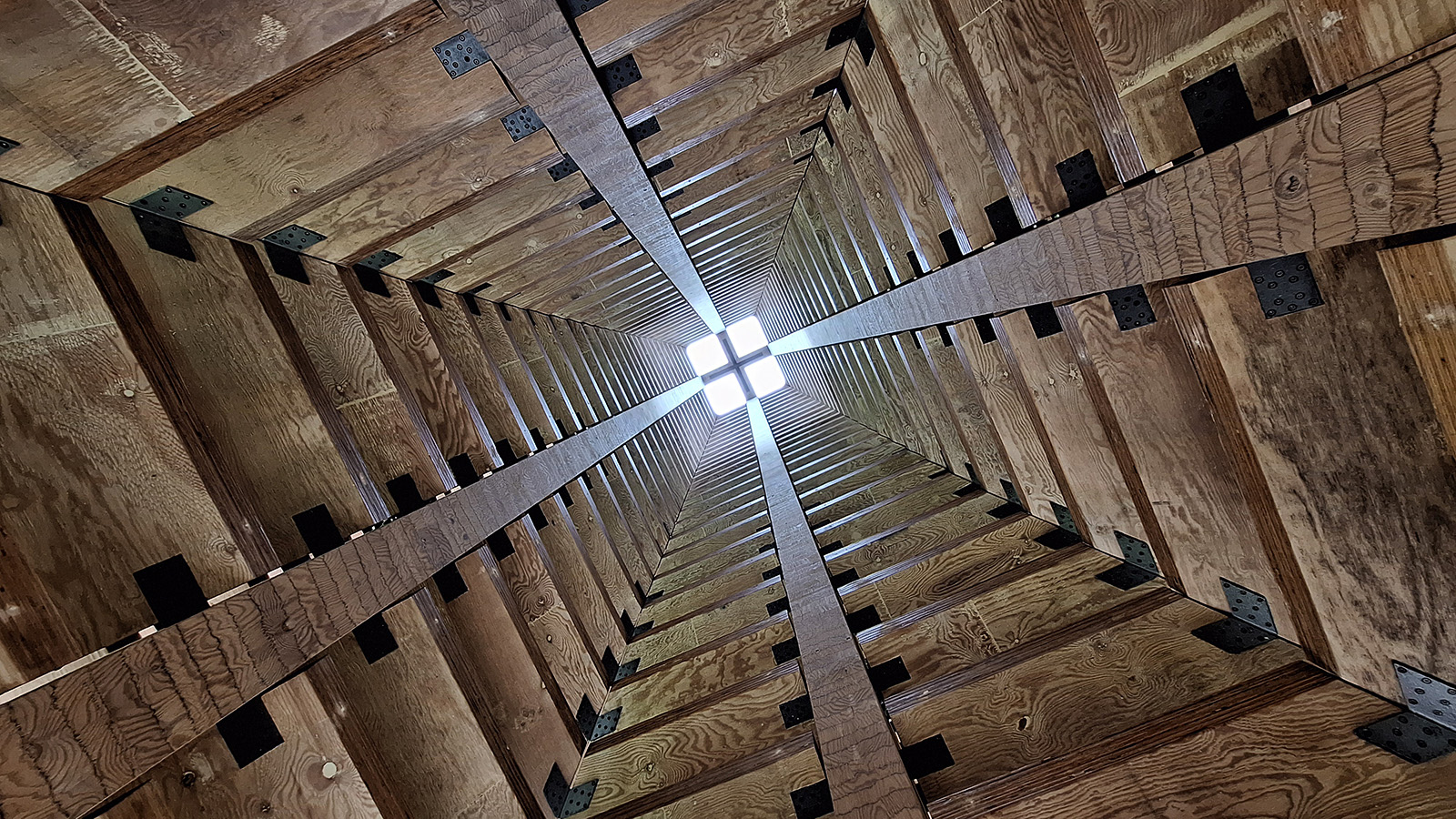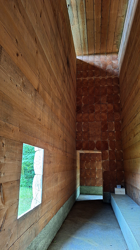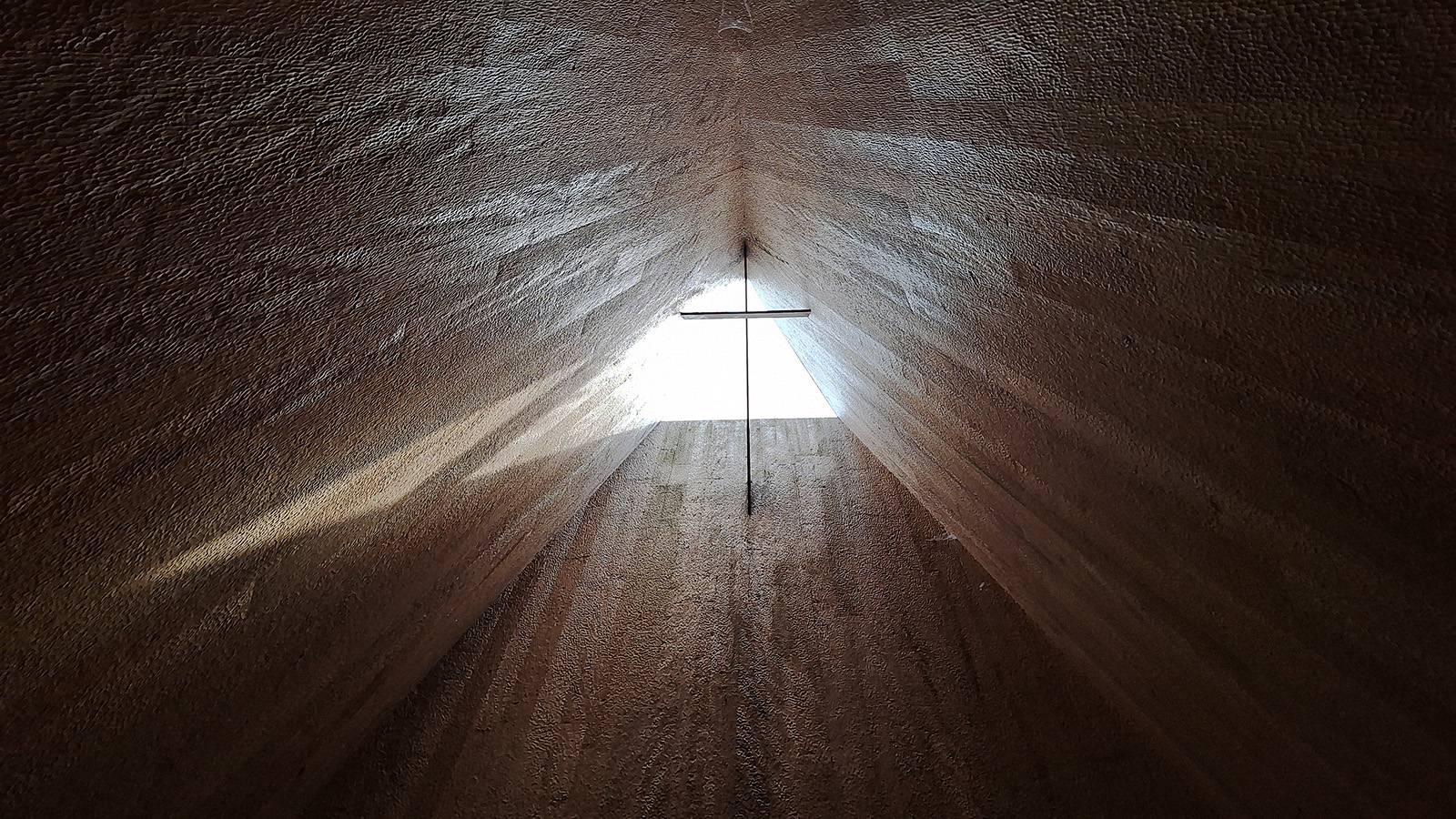 Der Bau selbst wirkt einfach und massiv, fast wie ein Holzstoß. Im Inneren tritt nur ein schmaler natürlicher Lichtstrahl von oben durch eine kleine Öffnung ein. Die düstere Umgebung lenkt die Aufmerksamkeit auf die beiden Lichtquellen am anderen Ende der Kapelle: die erhöhte kreuzförmige Öffnung sowie das einzige Fenster des Bauwerks.